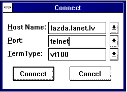 Jums pēc brīža atvērsies Telnet darba logs. Tad ar peles klikšķi izvēlieties komandu Connect, un pēc tam Remote System. Jums atvērsies pieslēguma izvēles lodziņš, kurā jāievada attālinātās mašīnas adrese (lauciņš Host Name)