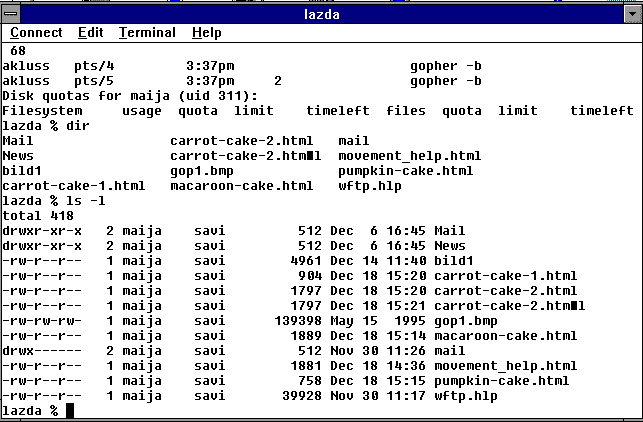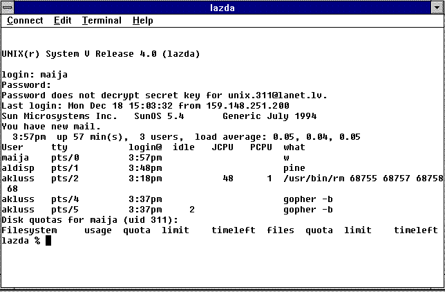 ** Jocīga un nesaprotama informācija uz ekrāna. Normālam darbam jālieto speciāli datu pārkodētāji. Reāli jālieto cita Telnet programma, kurai ir šādas papildiespējas.