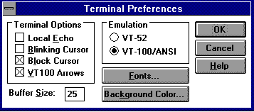 Termināla emulācija. Jāsaskaņo ar attālinātās mašīnas veidu. Izvēles iespējas VT-52 vai VT-100. |