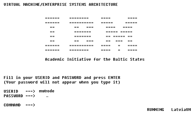 Jāievada USERID un PASSWORD, jānospiež <Enter>. Tālāk strādā līdzīgi kā pie lieldatora.
